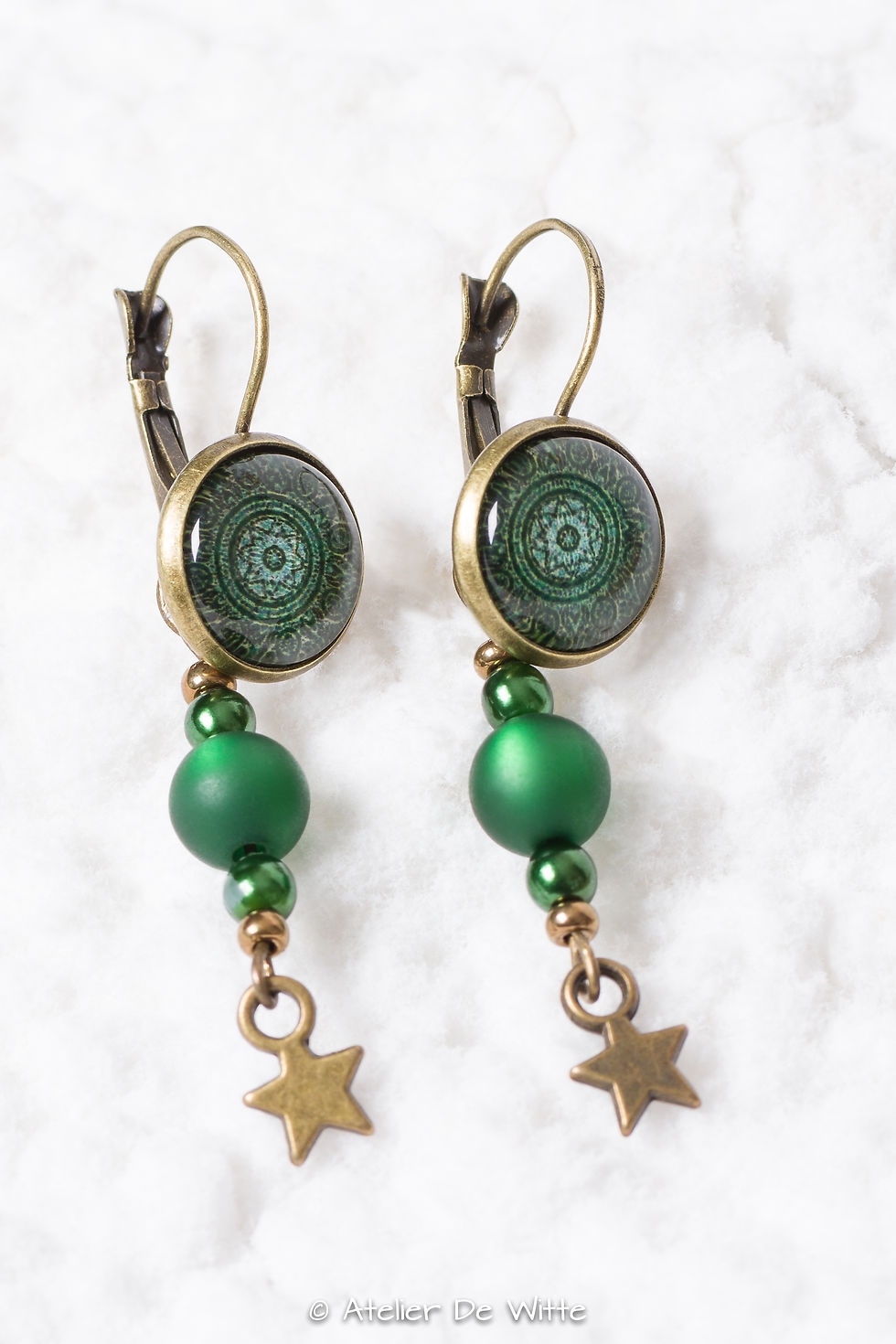 Klap oorbellen bronskleurig - donker groene cabochon - sterretje